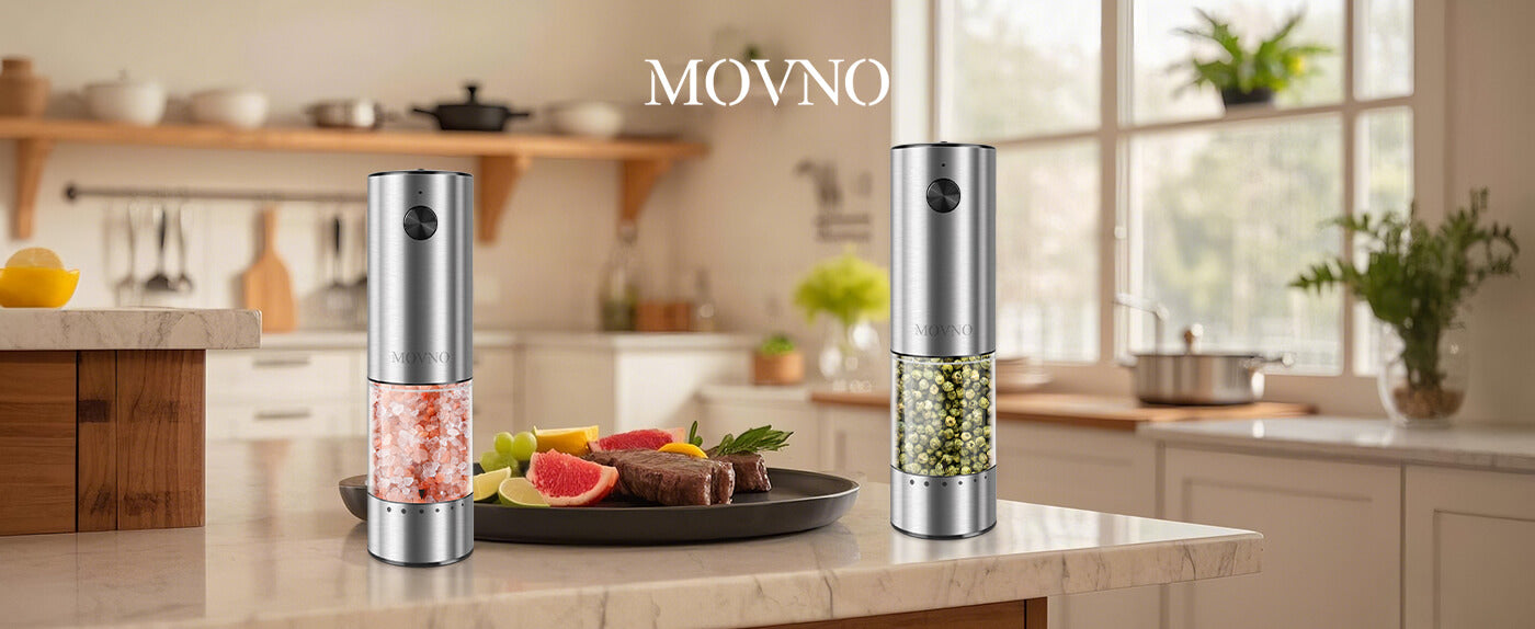 MOVNO Electric Salt & Pepper Grinder Set with Storage Base (Silver)
